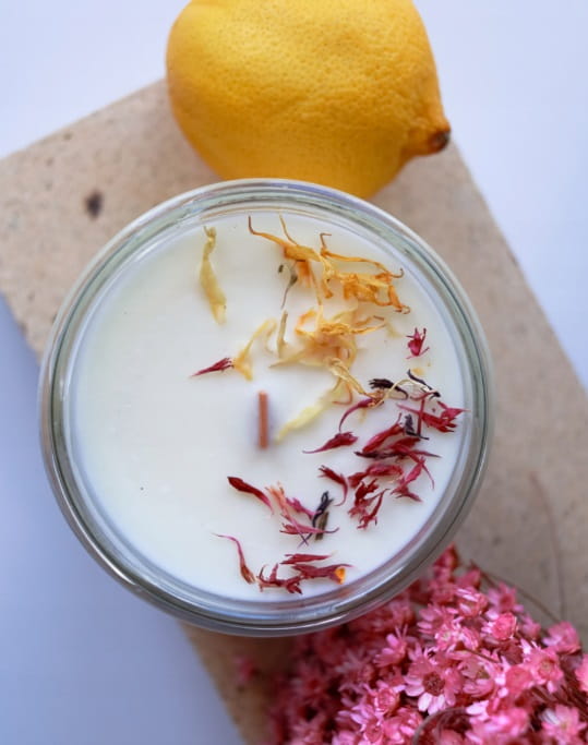 Świeca zawiera naturalne, suszone ozdoby, które możesz wyjąć po roztopieniu wosku lub zostawić, by dodatkowo cieszyły oczy. To idealne połączenie estetyki i funkcjonalności.