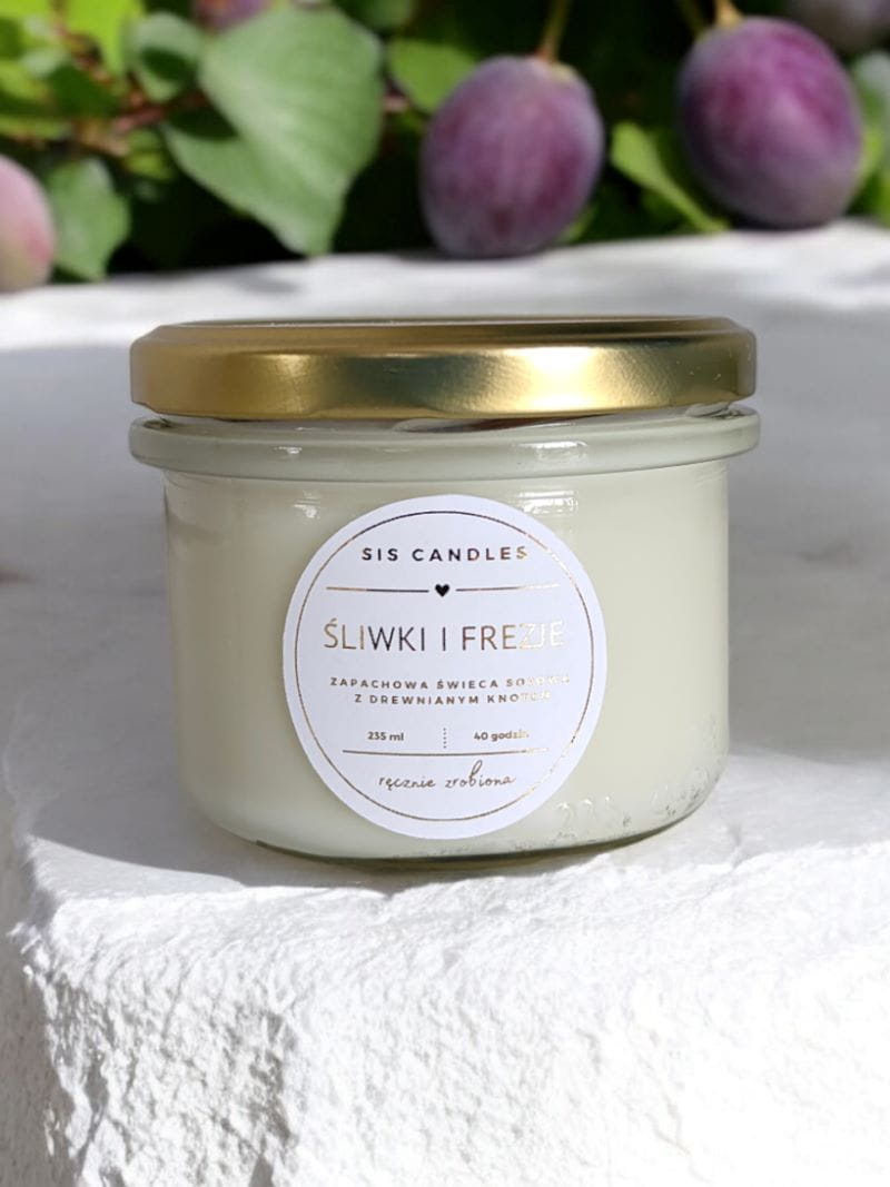 Śliwki i Frezje Świeca sojowa z drewnianym knotem 235 ml Sis Candles