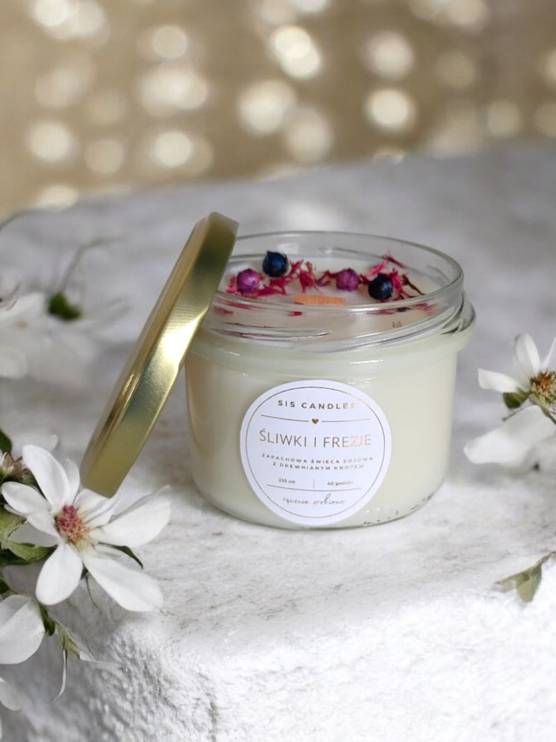 Zapachowa świeca sojowa z drewnianym knotem Śliwki i Frezje 235 ml