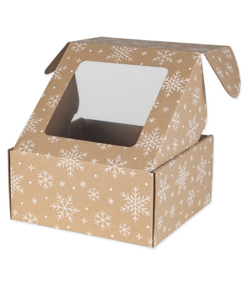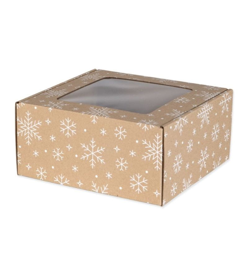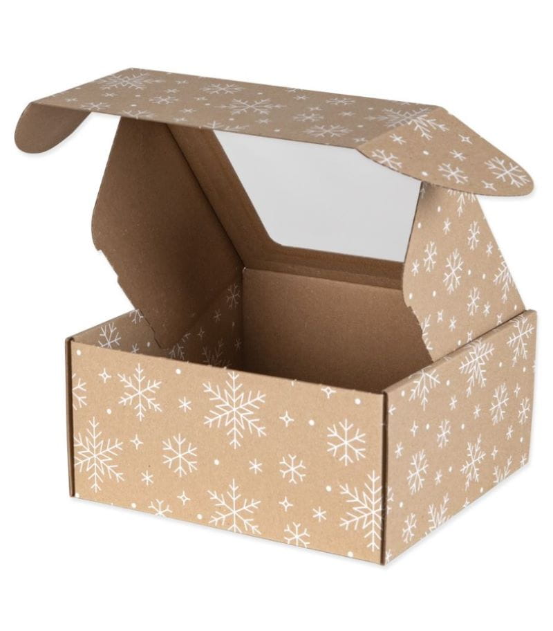 - Świąteczne pudełko fasonowe z oknem z nadrukiem w śnieżynki