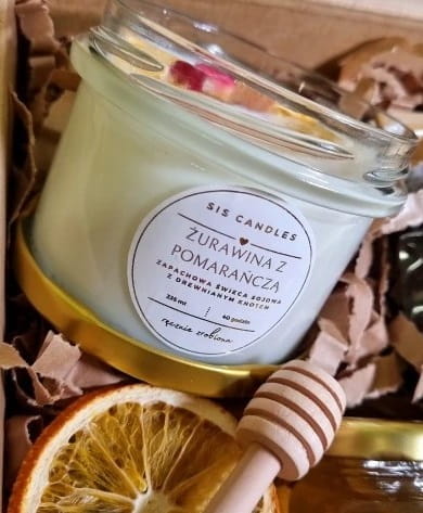 Taniej w zestawie!Wykonana ręcznie od początku do końca w rodzimej manufakturze świeca ozdobiona jest naturalnymi dodatkami: kwiatami, ziołami, przyprawami. Świeca relaksuje i stwarza miłą atmosferę domowego ogniska a naturalny, drewniany knot paląc się przypomina drewno palące się w kominku. Wosk sojowy topi się w niskiej temperaturze, dlatego świeca jest bardzo wydajna do 40 godzin palenia. Mocno wyczuwalny zapach pomarańczy w połączeniu z żurawiną jest wyjątkowo intensywny, aromatyczny i długo utrzymuje się w pomieszczeniu. Produkt jest wegański.