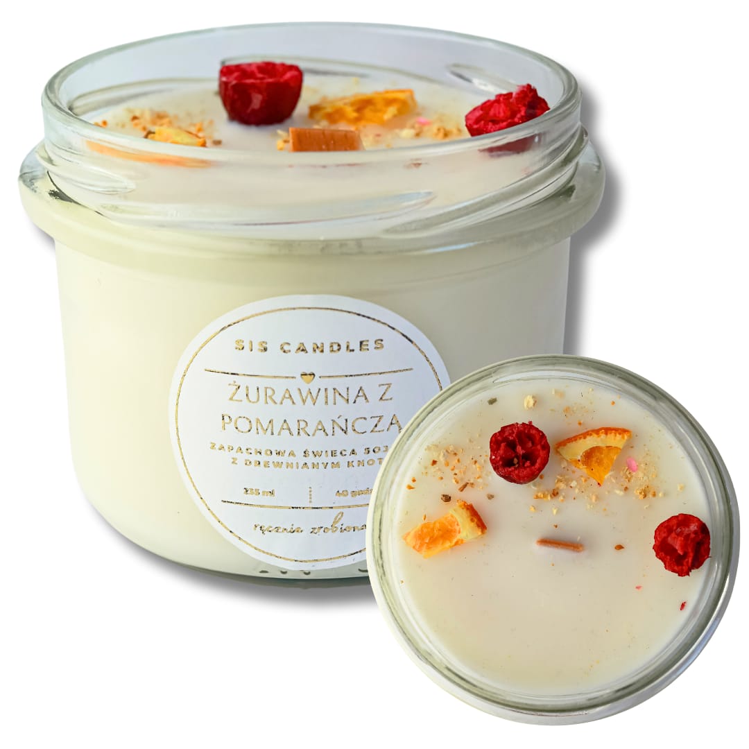 - POMARAŃCZA Z ŻURAWINĄ zapachowa świeca sojowa z drewnianym knotem 235ml. Czas palenia: ok. 45h