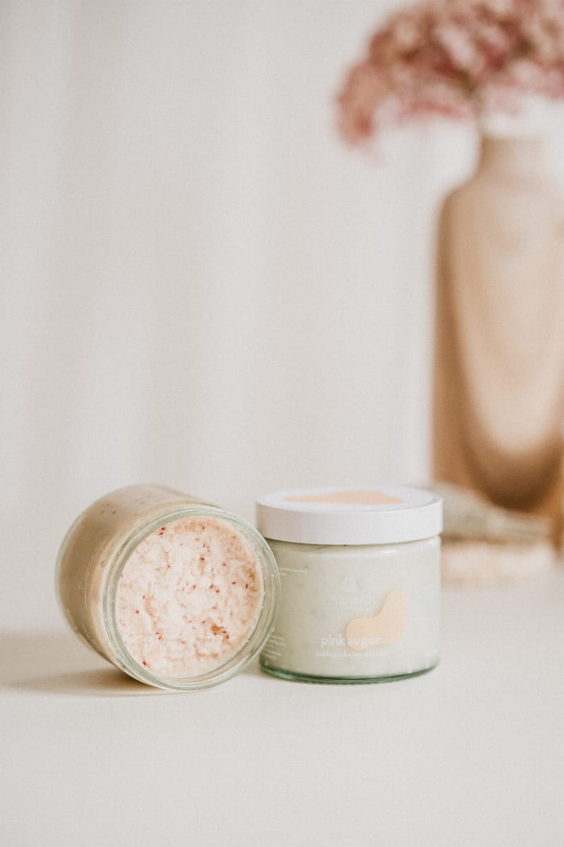 Skład: cukier, masło mango, olej z pestek winogron, olejek eteryczny z różowego grapefruita, masło Shea, wosk laurowy, alkohol cetylowy, kaprylan glicerolu (naturalny emolient), nasiona żurawiny, witamina E, olej słonecznikowy, ekstrakt olejowy z korzenia alkany barwierskiej.